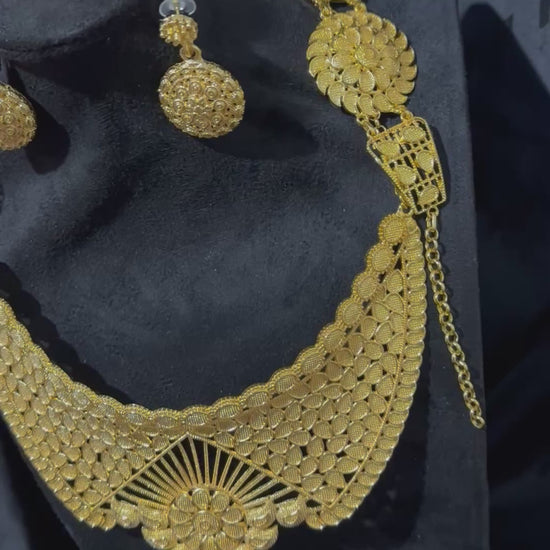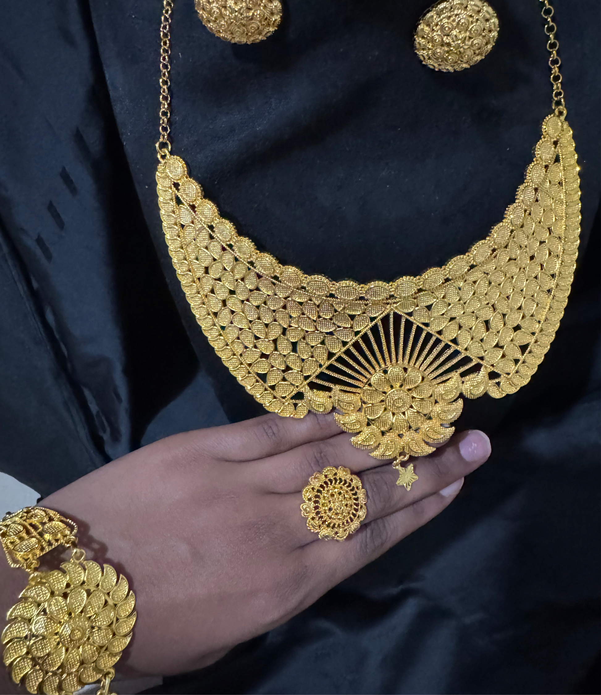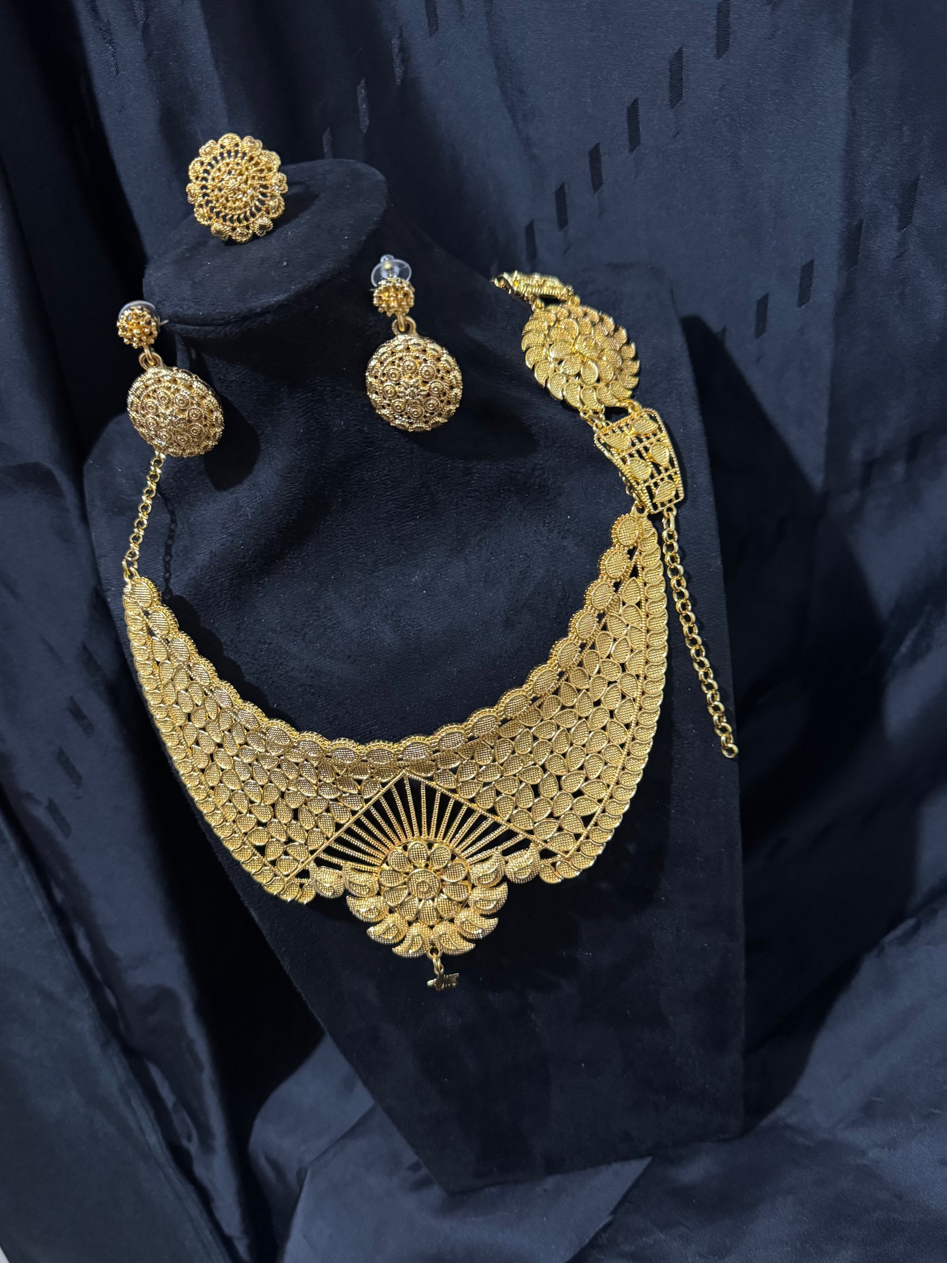 A beautiful five piece set adorned with a central floral motif moving up into a choker style high necklace.